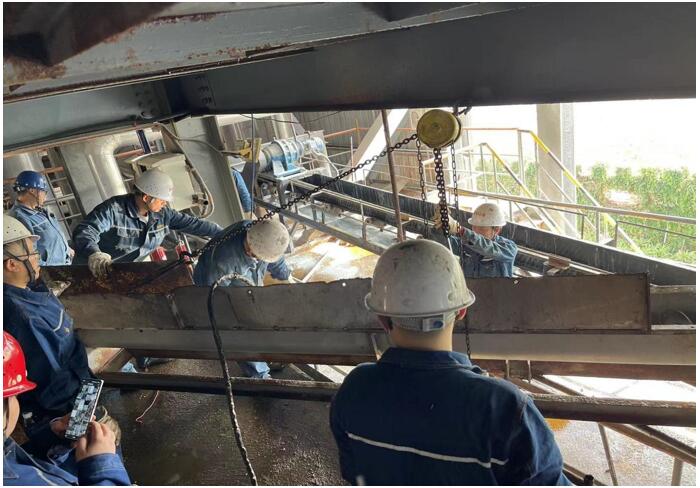 為更好解決后續(xù)物料輸送壓力,減少系統(tǒng)非計(jì)劃停機(jī),威遠(yuǎn)藍(lán)鼎生產(chǎn)部決定將兩條螺旋技改成輸送皮帶,10月30日,蒸發(fā)濃縮停機(jī)檢修,副總經(jīng)理黃安軍、副部長(zhǎng)楊平、宋雨鵬協(xié)同檢修班長(zhǎng)集中檢修骨干對(duì)氯化鈉螺旋進(jìn)行技改,31日13:30螺旋改輸送皮帶技改完成進(jìn)行試車,11月2日帶料試車正常,經(jīng)過一周使用觀察,本次技改相比螺旋故障率更低,物料輸送更松散、均勻,也大大改善了干燥前端下料堵塞等問題,同時(shí)也得到了釩廠運(yùn)行車間的認(rèn)可和生產(chǎn)員工一致好評(píng),體現(xiàn)了公司敢于創(chuàng)新、技改的精神。