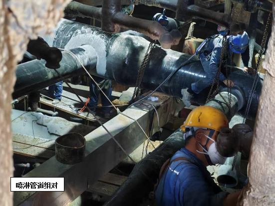 維修方案確定后,攀藍(lán)鼎立即開(kāi)始著手噴淋管道采購(gòu)預(yù)制工作,考慮到目前燒結(jié)產(chǎn)能不飽和,系統(tǒng)多處停機(jī)的因素,決定預(yù)制管道到廠后由檢修進(jìn)行拆除及更換,只保留技術(shù)性要求較高的玻鋼粘接由專(zhuān)業(yè)施工人員來(lái)完成。7月24日,在材料到廠后,檢修立即開(kāi)始在塔內(nèi)布置安全措施,并進(jìn)行噴淋層打拆工作,打拆過(guò)程中檢修對(duì)切下的三通支管進(jìn)行仔細(xì)甄別,磨損嚴(yán)重的進(jìn)行報(bào)廢處理,還具備使用價(jià)值的作為備件歸置,以確保物盡其用。打拆完畢后,檢修隨即進(jìn)行管道吊裝及內(nèi)部組裝配管工作,配管完成后防腐單位開(kāi)始進(jìn)場(chǎng)作業(yè),在此過(guò)程中檢修全程安排人員進(jìn)行組對(duì)及工程質(zhì)量監(jiān)督工作,并及時(shí)撤場(chǎng)收尾。